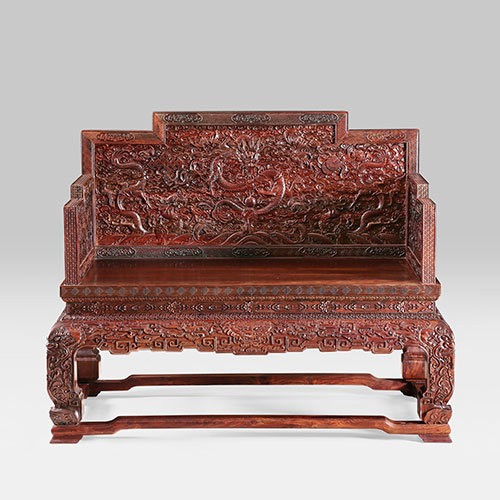 此寶座選用珍貴的大紅酸枝作為原材料,搭腦呈平頭狀,靠背中間高,向兩邊扶手遞減呈梯形。結(jié)構(gòu)設(shè)計(jì)巧妙,對(duì)稱布局,每個(gè)面板皆雕著一條騰飛的金龍,刀法精密,圓潤(rùn)渾厚;龍紋栩栩如生,云紋舒卷生動(dòng),龍的姿態(tài)各異,有的昂首前瞻,有的回首瞭望,動(dòng)感十足。座面嵌裝硬板,束腰內(nèi)收,雕有纏連枝紋,四條三彎腿做同樣的獸首,足下踩有豐碩的地平,端莊穩(wěn)重。